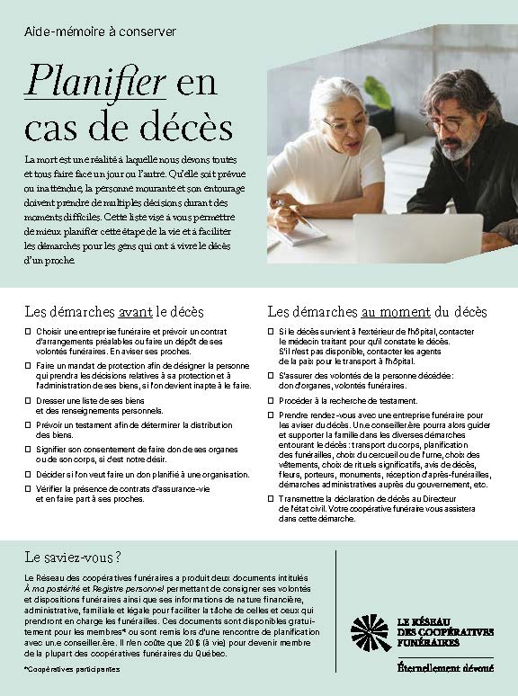 Cette liste vise à permettre de mieux planifier cette étape de la vie et à faciliter les démarches pour les gens qui ont à vivre le décès d’un proche.
